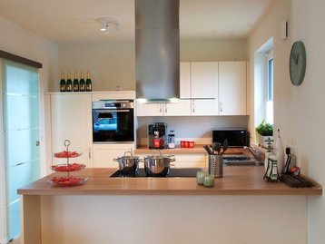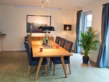 Bereits der Eingangsbereich mit seinen großen Fensterflächen und der Galerie offenbart das helle und besondere Ambiente des ganzen Hauses. Eine zweiflügelige Glastür verbindet die Diele mit dem großzügig arrangierten Wohn- und Essbereich, dem Herzstück der Stadtvilla. Beides ist bis zur Küche hin offen gestaltet und erstreckt sich über die gesamte Hausbreite – viel Platz für Kochabende mit Freunden und gemütliche Stunden mit der ganzen Familie.